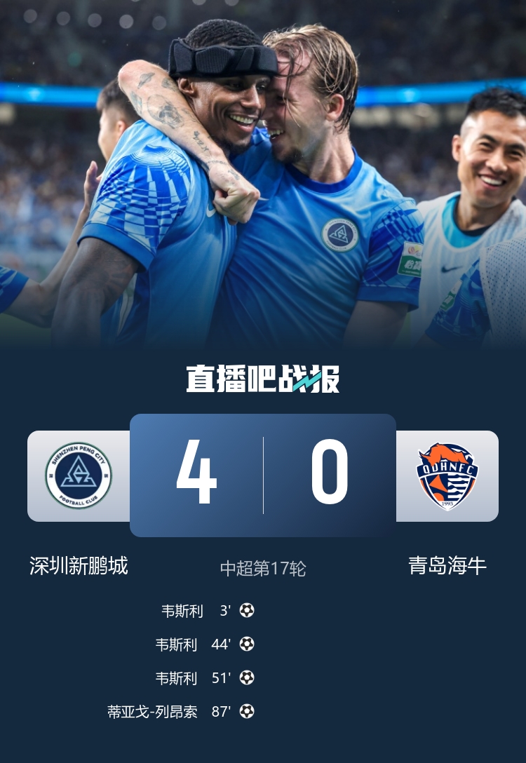 07月19日訊 中超第17輪,深圳新鵬城4-0大勝青島海牛。