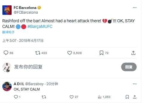 有球迷翻到19年4月17日歐冠巴薩vs曼聯(lián)時(shí),巴薩官方推特的一條推文:“拉什福德?lián)糁袡M梁!差點(diǎn)心臟病發(fā)作!好吧,冷靜!”球迷今日跟上評(píng)論:“好吧,冷靜!”