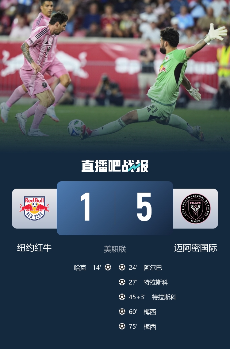 傷停補時9分鐘。全場比賽結束,紐約紅牛1-5邁阿密國際。
