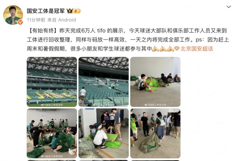 7月20日訊 據(jù)博主“國安工體是冠軍”報道,今天國安球迷和俱樂部工作人員又來到工體,對昨晚展示的TIFO進(jìn)行回收整理。