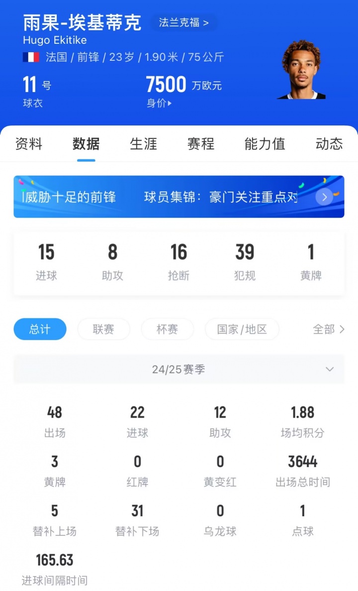2024年冬窗,?;倏俗饨杓用朔ㄌm克福,賽季結(jié)束后法蘭克福支付1650萬(wàn)歐買(mǎi)斷。上賽季,?;倏烁黜?xiàng)賽事48場(chǎng)22球12助。目前他的德轉(zhuǎn)身價(jià)為7500萬(wàn)歐。