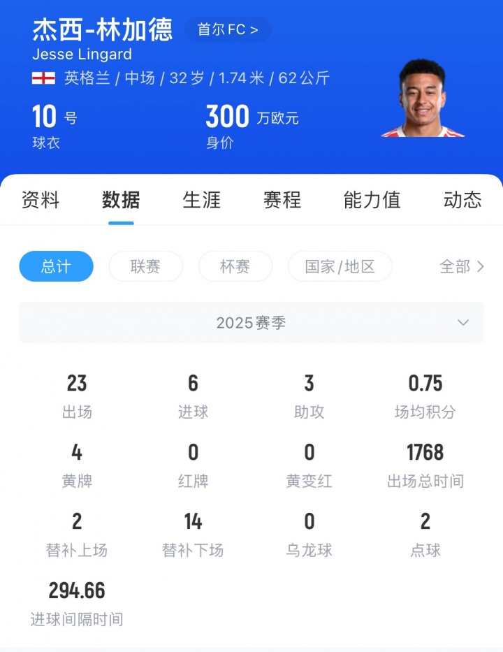 林加德現(xiàn)年32歲,本賽季為球隊出場23次,貢獻6球3助。