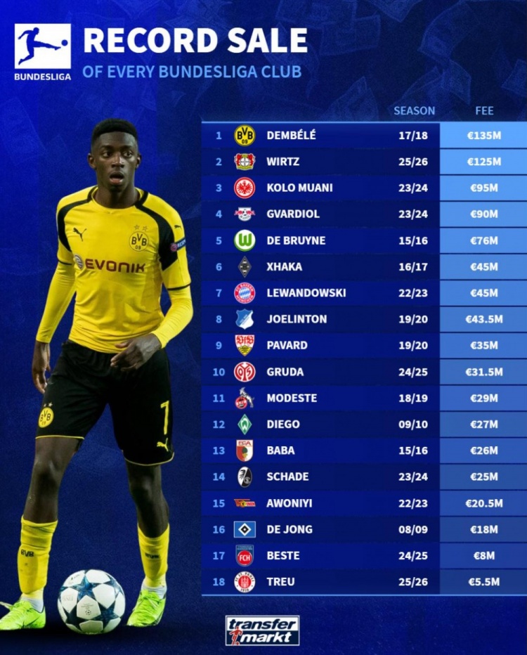 7月21日訊 德轉(zhuǎn)列德甲各隊歷史賣人轉(zhuǎn)會費紀錄排行,多特1.35億歐出售登貝萊居首,勒沃庫森1.25億歐賣維爾茨第二,穆阿尼、格瓦迪奧爾、德布勞內(nèi)3-5位。