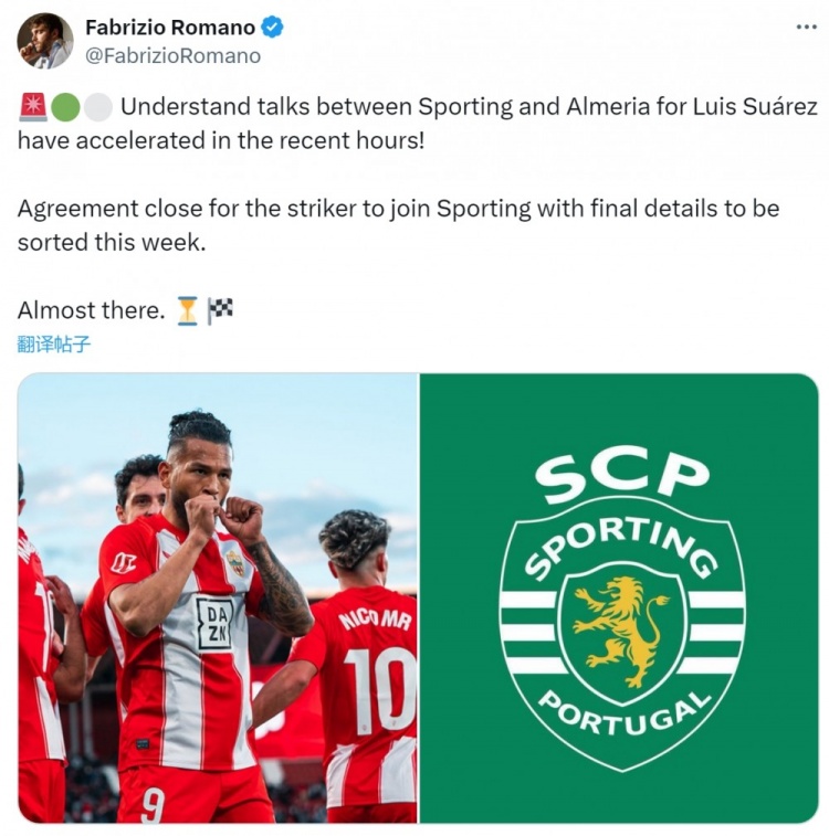 羅馬諾透露,葡萄牙體育對阿爾梅里亞27歲前鋒蘇亞雷斯感興趣,兩家俱樂部的談判在最近幾小時(shí)內(nèi)加速推進(jìn),接近達(dá)成協(xié)議,最終細(xì)節(jié)將在本周敲定,這筆交易就快成行了。