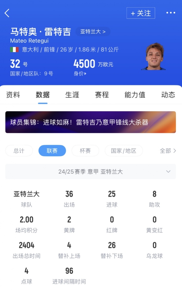 26歲的雷特吉上賽季為亞特蘭大出戰(zhàn)49場(chǎng),貢獻(xiàn)28球9助攻,德轉(zhuǎn)身價(jià)4500萬(wàn)歐。