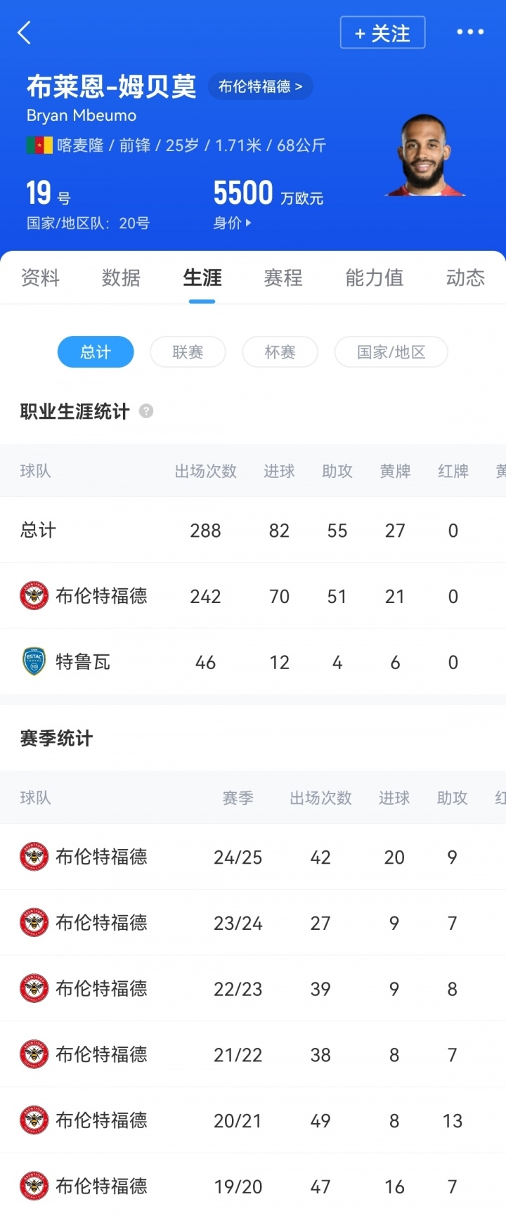 姆貝莫現(xiàn)年25歲,2019年布倫特福德從特魯瓦簽下他時(shí)只花了650萬歐元。效力6年,姆貝莫共為布倫特福德出場(chǎng)242次,打入70球51助攻。