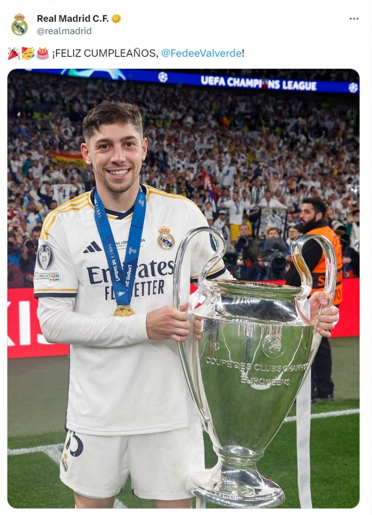 皇馬官方社媒曬出巴爾韋德與歐冠獎杯的合照,配文:“生日快樂,巴爾韋德!”