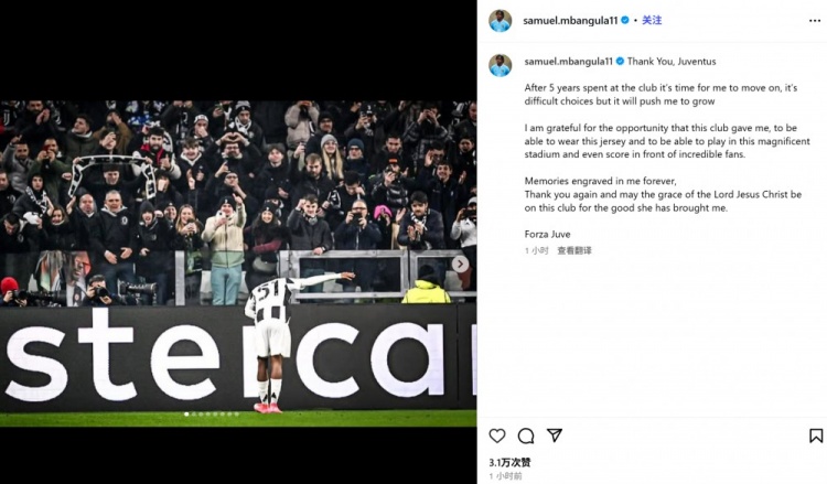 7月24日訊 尤文21歲邊鋒姆班古拉在今日官宣轉(zhuǎn)會(huì)不萊梅,他也通過社媒發(fā)文和尤文告別: