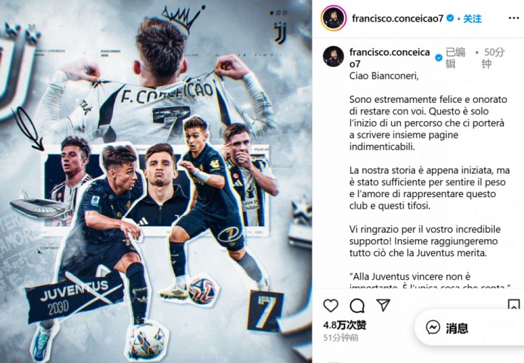 他寫道:“你們好,Bianconeri。我非常高興和榮幸能夠繼續(xù)與你們在一起。這只是一個旅程的開始,它將帶領我們一起書寫難以忘懷的篇章?!?/p>