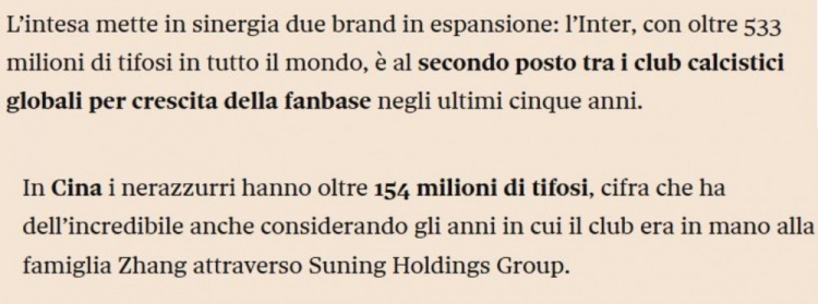報道寫道:“這項協(xié)議讓兩個處于擴張中的品牌形成協(xié)同效應。國米在全球擁有超過5.33億球迷,是過去五年中全球粉絲增長速度第二快的足球俱樂部?!?/p>