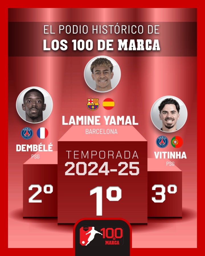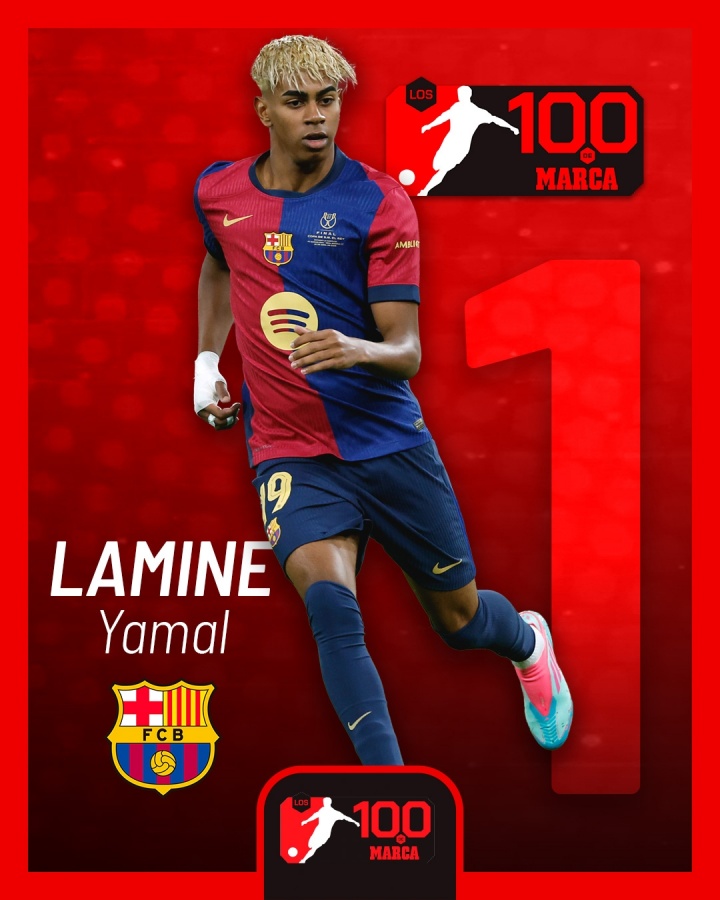07月25日訊 西班牙媒體《馬卡報(bào)》發(fā)起24/25賽季世界足壇百大球星評選,18歲亞馬爾當(dāng)選賽季最佳球員,以超過200分的優(yōu)勢力壓登貝萊和維蒂尼亞獲獎。