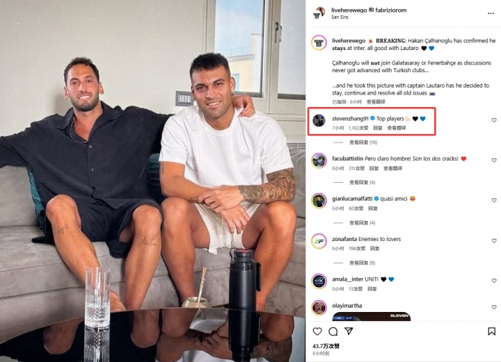 在羅馬諾報(bào)道兩人和好的帖子下,前國米主席張康陽評(píng)論:頂級(jí)球員們。