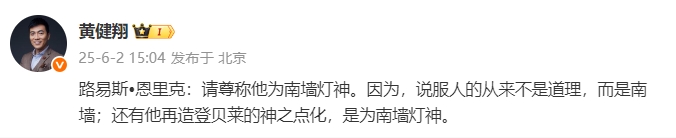 黃健翔寫道:路易斯-恩里克:請尊稱他為南墻燈神。因?yàn)?,說服人的從來不是道理,而是南墻;還有他再造登貝萊的神之點(diǎn)化,是為南墻燈神。