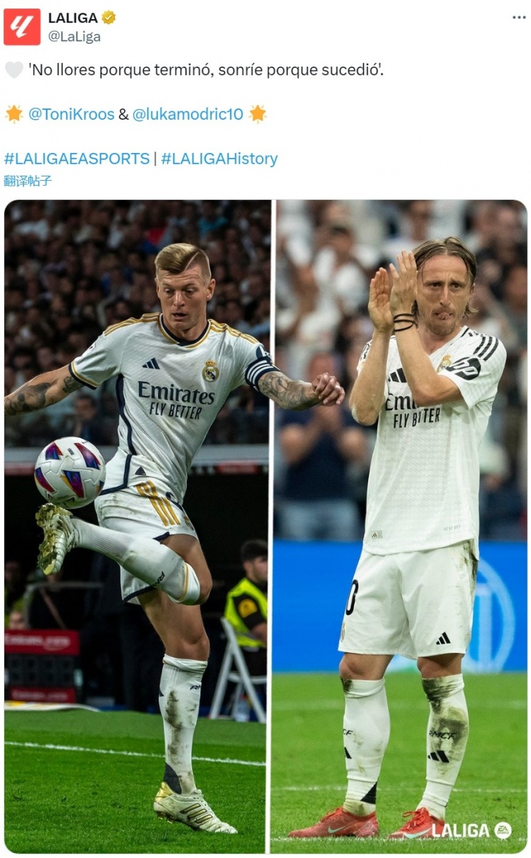 西甲官方社媒曬出克羅斯和莫德里奇效力皇馬時期的照片,配文:“不要因為它結(jié)束了而哭泣,要因為它發(fā)生過而微笑。”