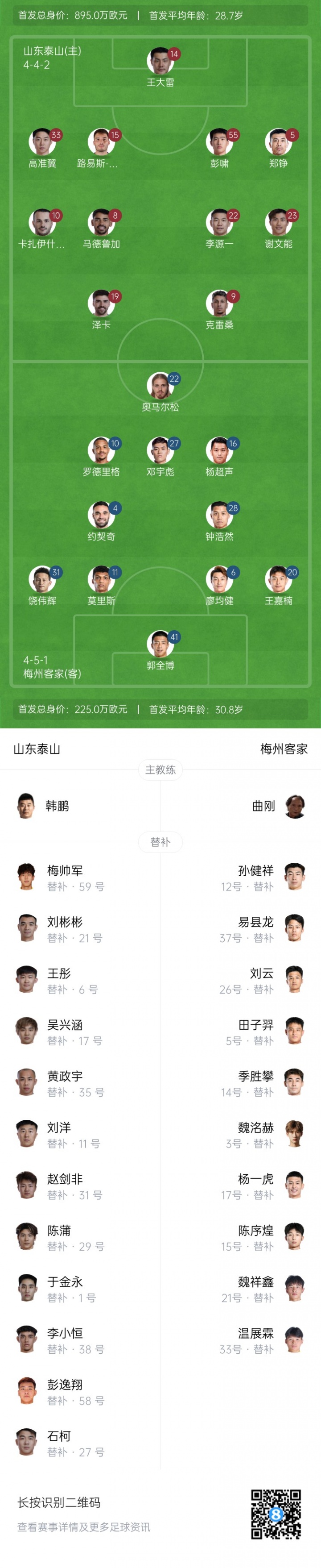 泰山vs梅州首發(fā):5外援PK4外援,洛佩斯首秀 彭嘯先發(fā) 楊超聲出戰(zhàn)