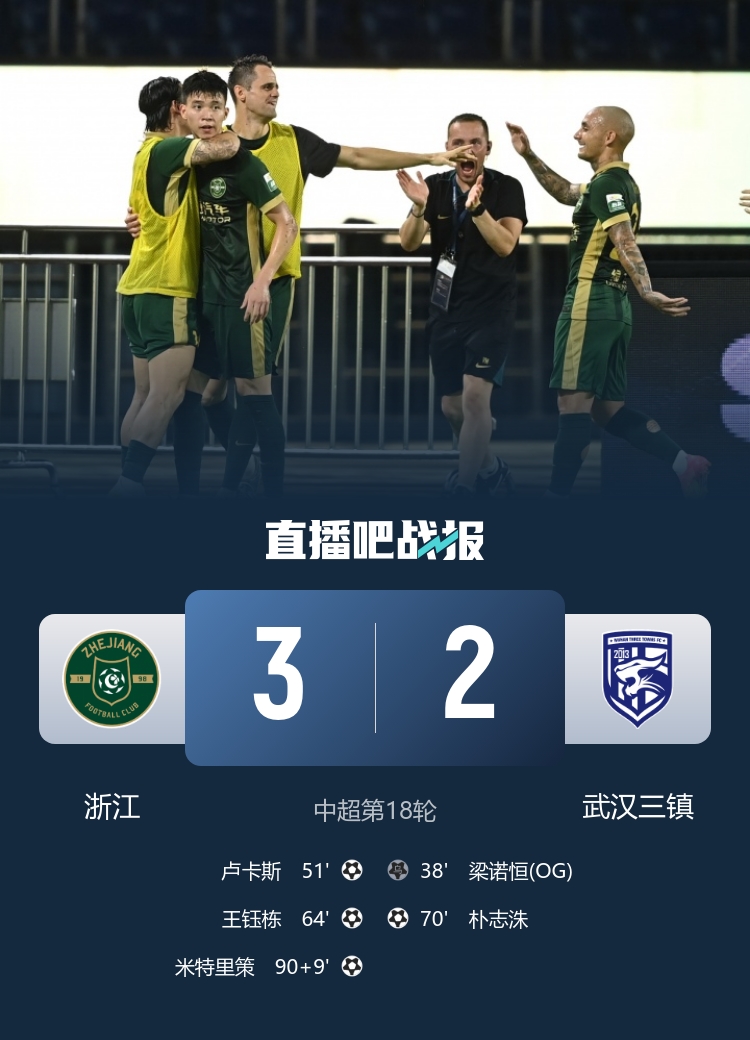 讀秒絕殺!浙江3-2武漢三鎮(zhèn) 米特里策制勝王鈺棟賽季第11球&傷退