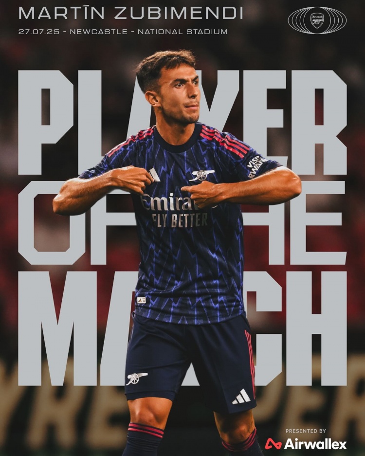 此役新援祖比門迪為阿森納首發(fā)出戰(zhàn),阿森納官方宣布,祖比門迪當(dāng)選本場(chǎng)比賽阿森納隊(duì)內(nèi)最佳球員。