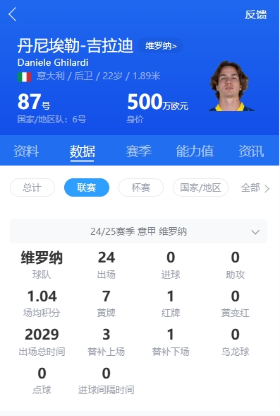 丹尼埃勒-吉拉迪現(xiàn)年22歲,上賽季為維羅納在聯(lián)賽中出場(chǎng)24場(chǎng),現(xiàn)身價(jià)500萬(wàn)歐元。