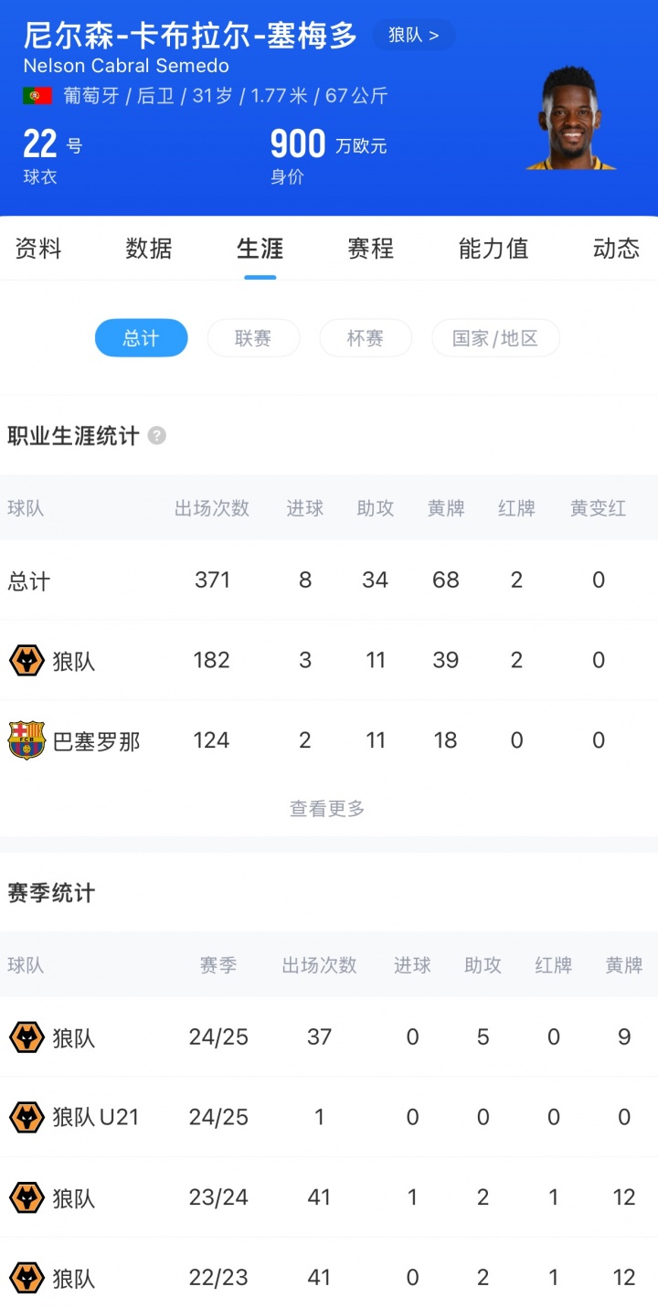 葡萄牙邊衛(wèi)在2020年9月加盟狼隊,四年間共代表狼隊出戰(zhàn)182場比賽。盡管征程并非一帆風(fēng)順,但這位后衛(wèi)在隊內(nèi)的地位逐年攀升。上賽季最艱難時期,31歲的他臨危受命擔任隊長,最終率隊成功保級。