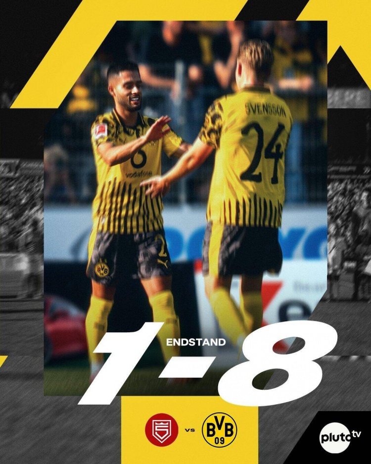多特在本場(chǎng)比賽占據(jù)66%控球率優(yōu)勢(shì),射門(mén)20-8、射正13-6、角球4-1均處于領(lǐng)先。本卡拉、揚(yáng)-庫(kù)托、薩比策、阿德耶米在前28分鐘連進(jìn)4球,布蘭特在第36和37分鐘雙響,主隊(duì)由Josue Santo在第44分扳回一城。易邊再戰(zhàn),拜爾和埃茲希勒各入一球?qū)⒈确侄ǜ駷?-1。