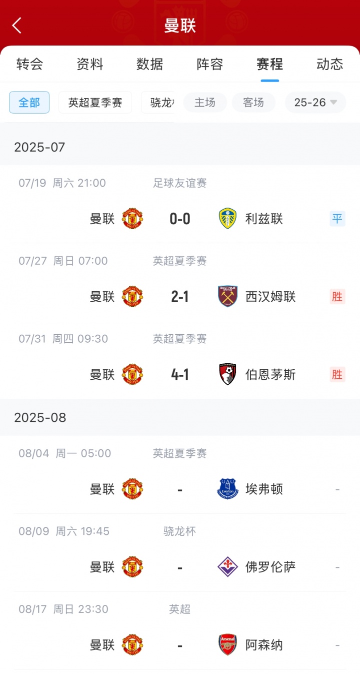 曼聯(lián)8月還有兩場季前熱身賽,分別對陣埃弗頓、佛羅倫薩。隨后新賽季英超將打響,曼聯(lián)首輪對陣阿森納。