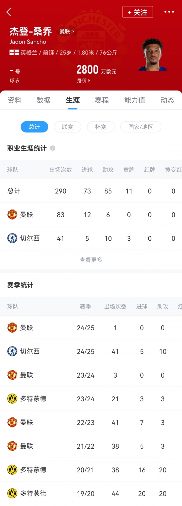 桑喬2021年夏窗以8500萬歐元的轉(zhuǎn)會費從多特加盟曼聯(lián),2024年冬窗他又被回租至多特。兩次效力多特期間,桑喬共為多特出戰(zhàn)158次,打入53球67助攻。