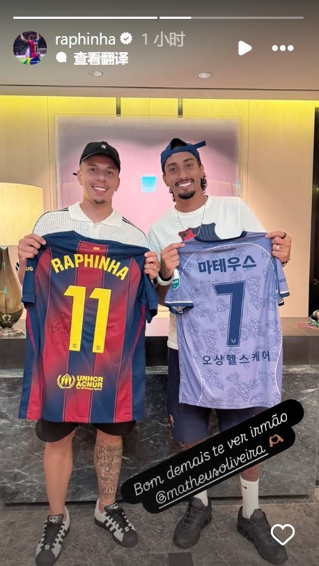 巴薩正在韓國進(jìn)行季前友誼賽,他們7月31日7-3擊敗首爾FC。賽后,拉菲尼亞曬出與K1聯(lián)賽安陽FC球員馬修斯-奧利維拉交換球衣的照片,并配文:很高興見到你,兄弟。