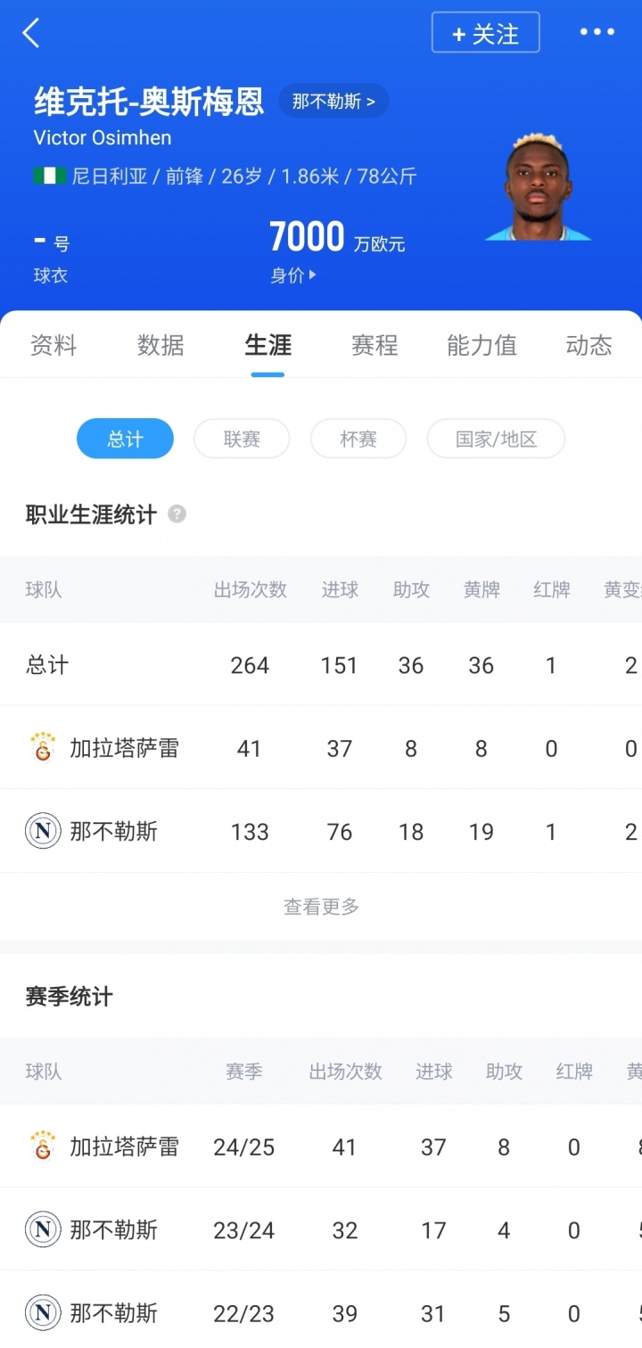 奧斯梅恩,現(xiàn)年26歲,尼日利亞前鋒,2020年冬窗那不勒斯花費(fèi)7890萬歐從里爾引進(jìn)球員。上賽季奧斯梅恩被外租至加拉塔薩雷,出戰(zhàn)41場比賽,貢獻(xiàn)37球8助。球員目前德轉(zhuǎn)身價(jià)7000萬歐,巔峰曾達(dá)到1.2億歐。