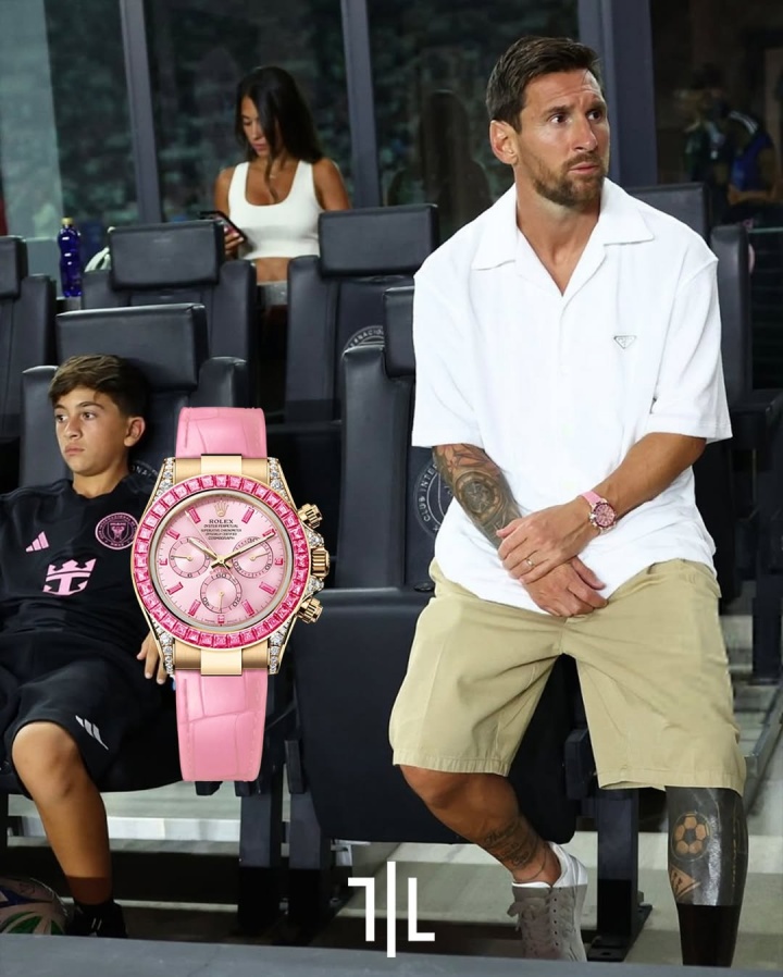 太陽報表示梅西這塊勞力士Barbie表是限量款,轉(zhuǎn)售價超過70萬鎊。使用了粉紅色藍寶石鉆石,18k黃金。其配色和邁阿密國際主場球衣色調(diào)相符。這款表全球僅限量10塊。梅西還有一款價值超50萬鎊的限量款勞力士Daytona表。