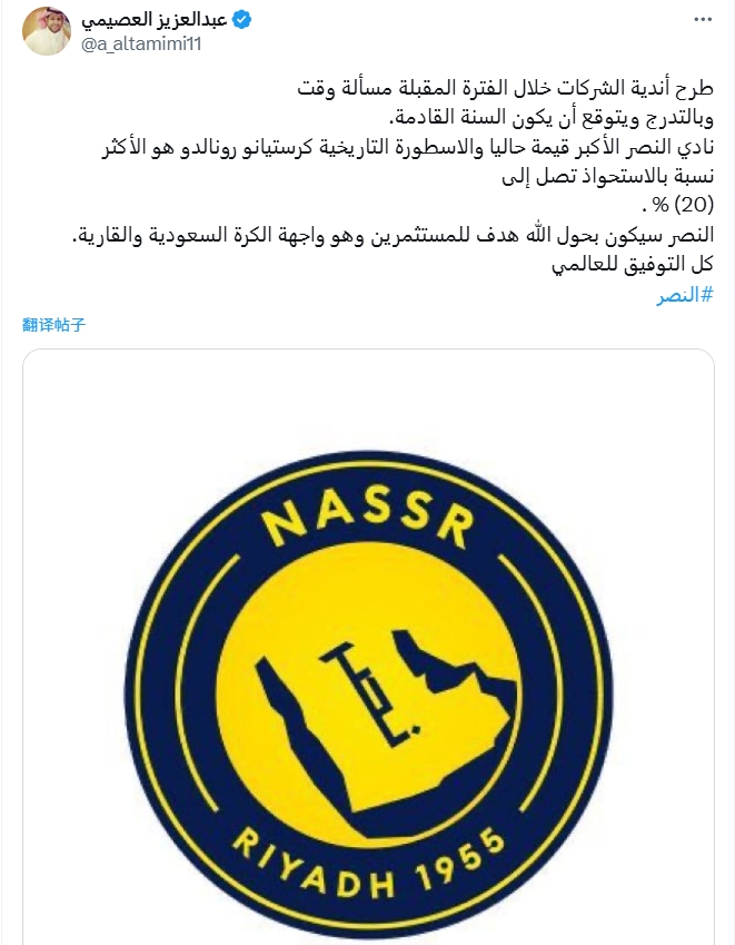 利雅得勝利目前是最有價(jià)值的俱樂部,C羅目前持股比例最高,達(dá)到了20%,利雅得勝利將成為投資者關(guān)注的焦點(diǎn),成為沙特和亞洲足球的門面。