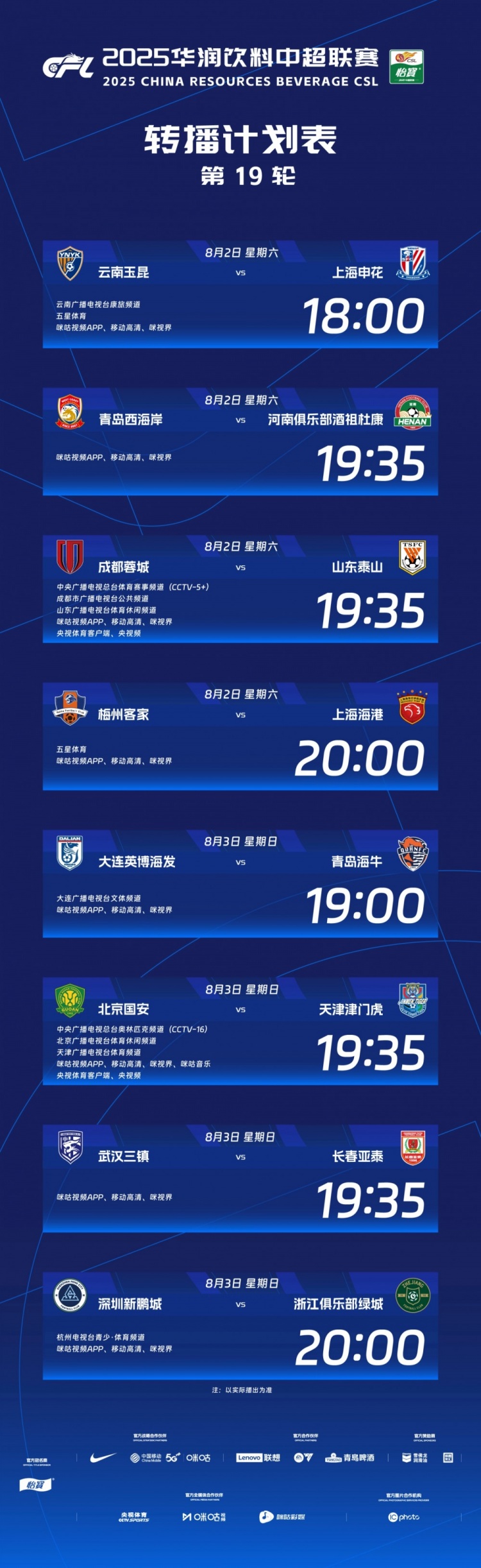 8月1日訊 中超聯(lián)賽官方公布了第19輪的賽事轉(zhuǎn)播情況,其中成都蓉城vs山東泰山、北京國安vs天津津門虎這兩場比賽央視將進(jìn)行直播。