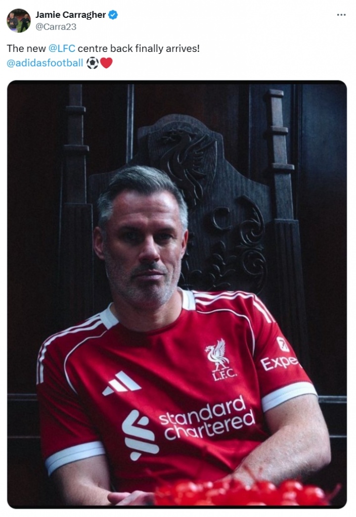利物浦名宿、現(xiàn)評論員卡拉格社媒曬圖,他穿上了利物浦新賽季的主場球衣,并且配文:利物浦的新中衛(wèi)終于到位了!