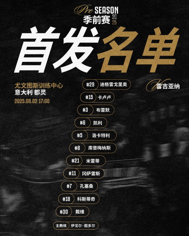 尤文首發(fā):29-迪格雷戈里奧、15-卡盧盧、3-布雷默、6-凱利、5-洛卡特利、8-庫普梅納斯、21-米雷蒂、18-科斯蒂奇、7-孔塞桑、11-岡薩雷斯、30-戴維