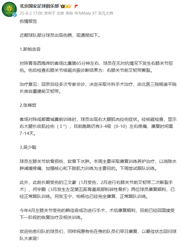 08月02日訊 國(guó)安官方發(fā)布傷情公告,球隊(duì)外援斯帕吉奇右膝前叉韌帶撕裂,將接受前叉韌帶重建。除此以外,張稀哲右大腿肌肉拉傷將缺陣2周,吳少聰左膝關(guān)節(jié)軟骨損傷下周跟隊(duì)訓(xùn)練。