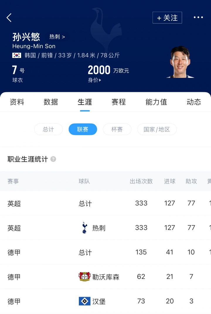 孫興慜現(xiàn)年33歲,旅歐17年,先后效力于漢堡、勒沃庫(kù)森和熱刺,在德甲出場(chǎng)135次取得41球10助攻,在英超出場(chǎng)333次取得127球77助攻。