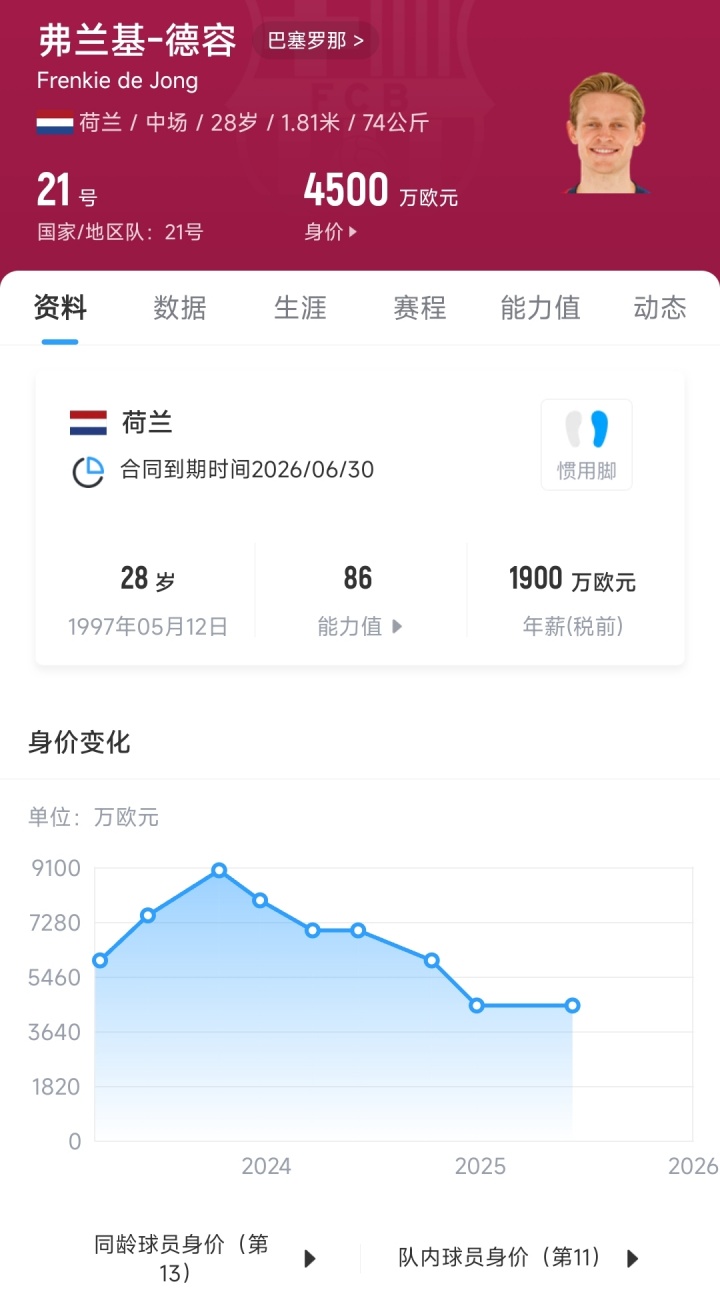 德容與巴薩的現(xiàn)有合同將在2026年6月30日到期,德容在2020年時與巴薩續(xù)約,并將部分薪資延期發(fā)放,以幫助俱樂部。目前德容在巴薩年薪為1900萬歐元,但由于此前的薪水延期發(fā)放,巴薩原本需要在本賽季向德容支付3750萬歐元的薪水。