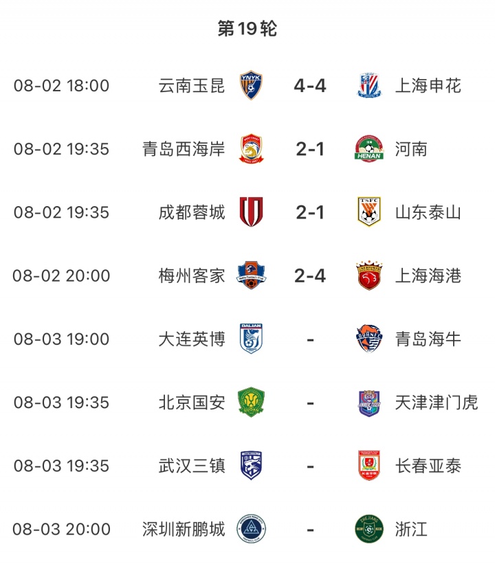 08月02日訊 今日中超第19輪4場(chǎng)比賽戰(zhàn)罷,申花4-4戰(zhàn)平玉昆收獲1分,海港4-2戰(zhàn)勝梅州取3分僅距榜首4分,蓉城2-1十人泰山暫位第3,泰山仍第5。最新積分榜如圖: