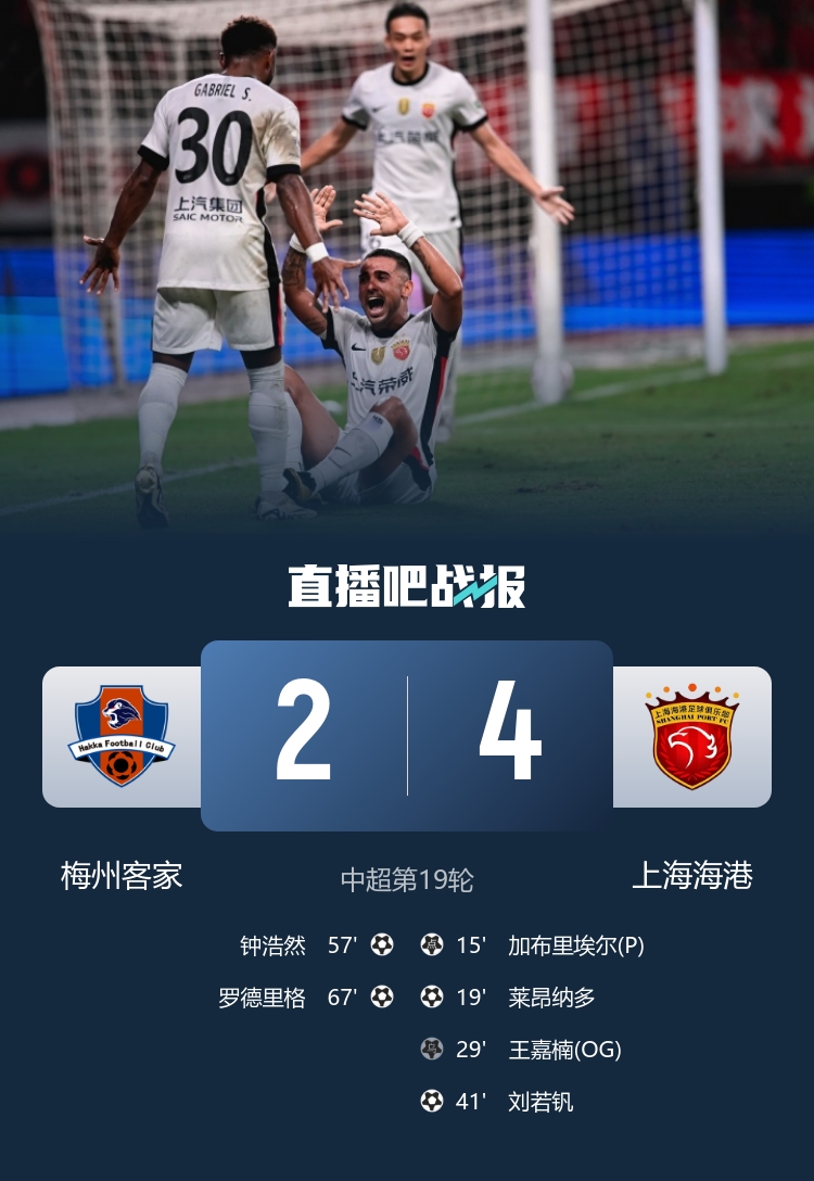 8月2日訊 北京時間20:00,中超第19輪梅州客家vs上海海港,比賽在梅州五華奧體中心。上半場,加布里埃爾造點+點射破門!劉若釩助攻萊昂納多建功,王嘉楠自擺烏龍!王燊超助攻劉若釩破門,劉若釩半場傳射建功!下半場,鐘浩然、羅德里格幫助梅州客家連追2球!最終,上海海港4-2擊敗梅州客家,海港近10輪不敗距榜首4分;梅州客家近12場不勝。