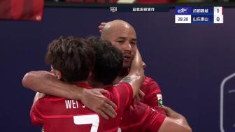 第28分鐘,古爾芬克爾拼搶中獲得球權,在左路送出傳中,中路費利佩停球同時抗住對手,隨后左腳小角度打門得手,成都蓉城1-0山東泰山?!?/strong>