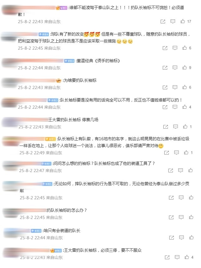 看到王大雷扔袖標(biāo)的舉動,山東泰山的球迷感到難以理解。在球隊的官博評論區(qū),球迷留言表達(dá)了對王大雷的不滿,并希望俱樂部方面做出處理。