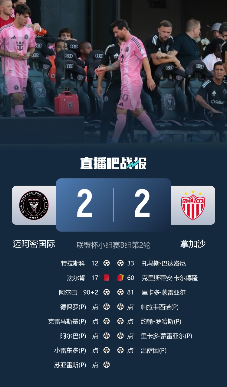 8月3日訊 北京時(shí)間8月3日07:00,聯(lián)盟杯小組賽B組第2輪邁阿密國(guó)際迎戰(zhàn)拿加沙的比賽在大通體育場(chǎng)進(jìn)行,上半場(chǎng)梅西第8分鐘傷退,德保羅助攻特拉斯科兜射首開記錄,法爾肯直紅被罰下,巴達(dá)洛尼抽射扳平比分,半場(chǎng)結(jié)束,十人邁阿密國(guó)際1-1拿加沙。下半場(chǎng)羅哈斯遠(yuǎn)射中楣,卡爾德隆兩黃一紅被罰下,蒙雷亞爾推射反超比分,德保羅助攻阿爾巴頭球絕平,常規(guī)時(shí)間結(jié)束,十人邁阿密2-2十人拿加沙,點(diǎn)球大戰(zhàn)諾沃撲點(diǎn),最終邁阿密點(diǎn)球戰(zhàn)7比6戰(zhàn)勝拿加沙取得兩連勝。