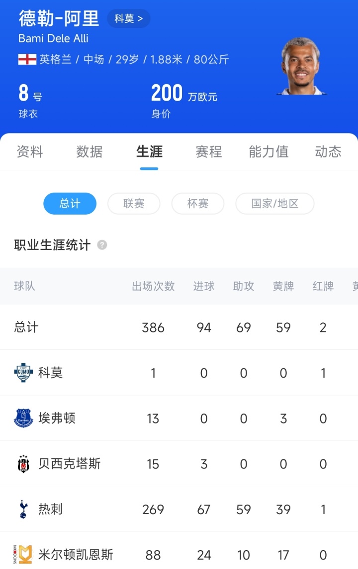 08月03日訊 意大利媒體《米蘭體育報》消息,德勒-阿里不在科莫的新賽季計劃中,他正在認真考慮退役的選擇。