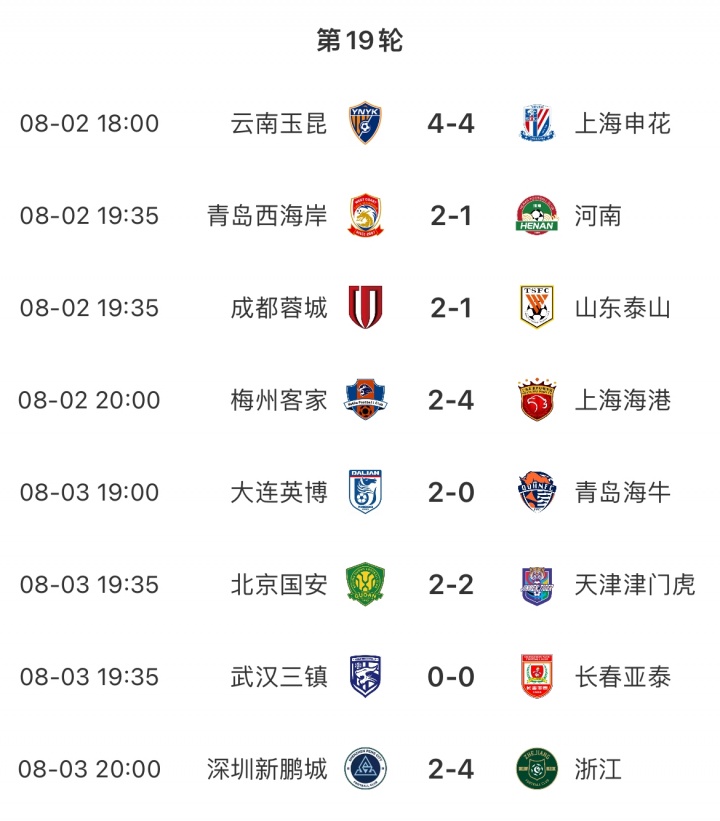 中超第19輪賽果↓