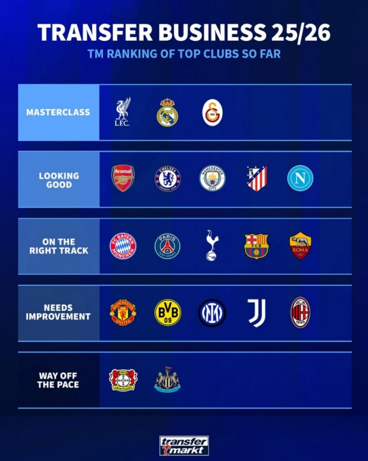 8月3日訊 德轉(zhuǎn)為今年夏窗豪門球隊(duì)目前的轉(zhuǎn)會(huì)操作進(jìn)行了評級,其中大師級的有利物浦、皇馬、加拉塔薩雷三隊(duì),具體如下: