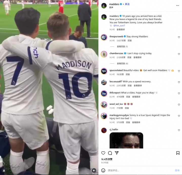 麥迪遜在社媒中曬出了自己與孫興慜合集片段,并配文:“10年前你來到這里是還是一個孩子?,F(xiàn)在你作為傳奇&我的朋友的身份離開。你就是托特納姆孫尼。永遠(yuǎn)愛你兄弟?!?/p>