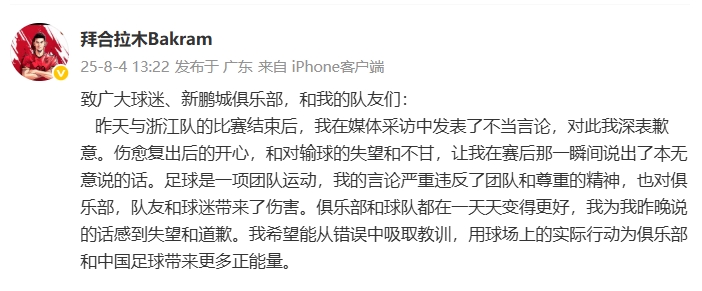 08月04日訊 針對昨日中超賽后對隊友的批評言論,拜合拉木在社交媒體上發(fā)文致歉。致歉內(nèi)容如下: