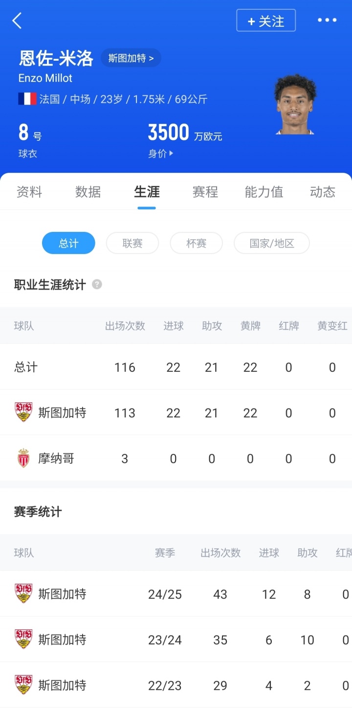 恩佐-米洛,23歲法國中場(chǎng),上賽季代表斯圖加特出戰(zhàn)43場(chǎng)比賽,貢獻(xiàn)12球8助,目前德轉(zhuǎn)身價(jià)3500萬歐。
