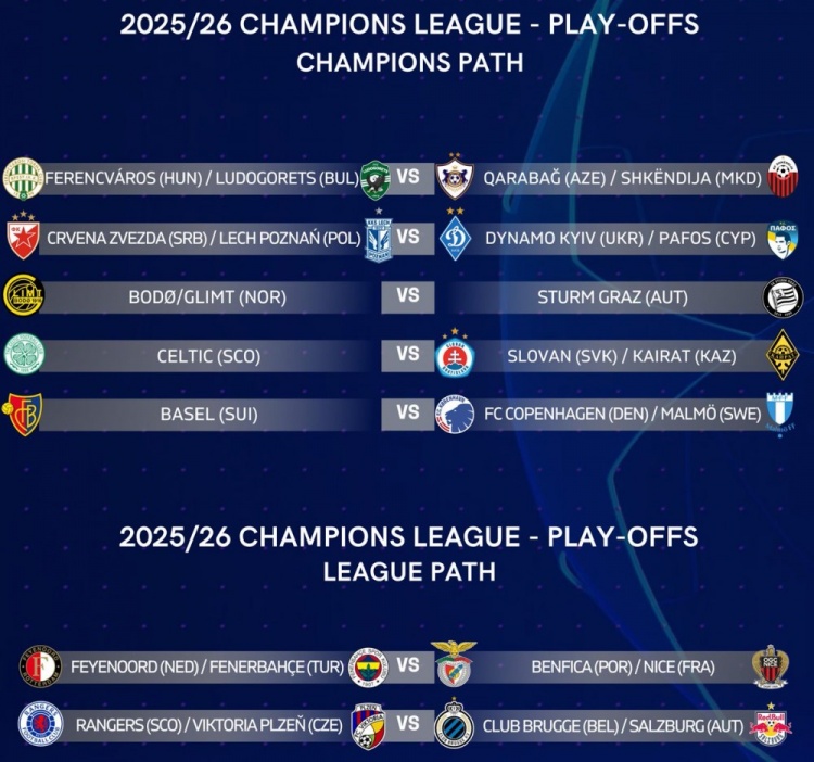 8月4日訊 歐冠附加賽抽簽結(jié)果出爐,費(fèi)耶諾德vs費(fèi)內(nèi)巴切勝者將對(duì)陣本菲卡vs尼斯勝者。