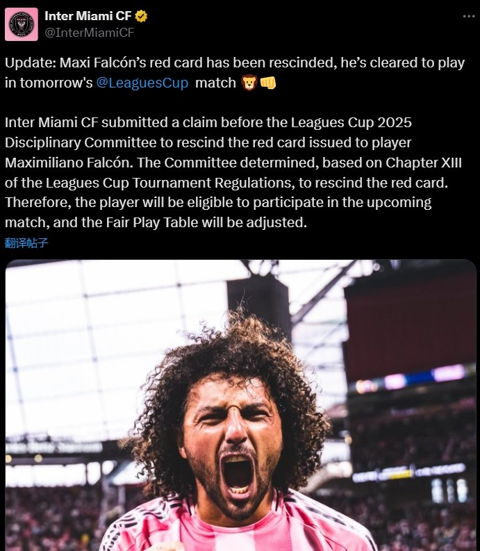 邁阿密官方寫道:“最新消息:法爾肯的紅牌已被撤銷,他將可以出戰(zhàn)明天的 聯(lián)盟杯比賽。”