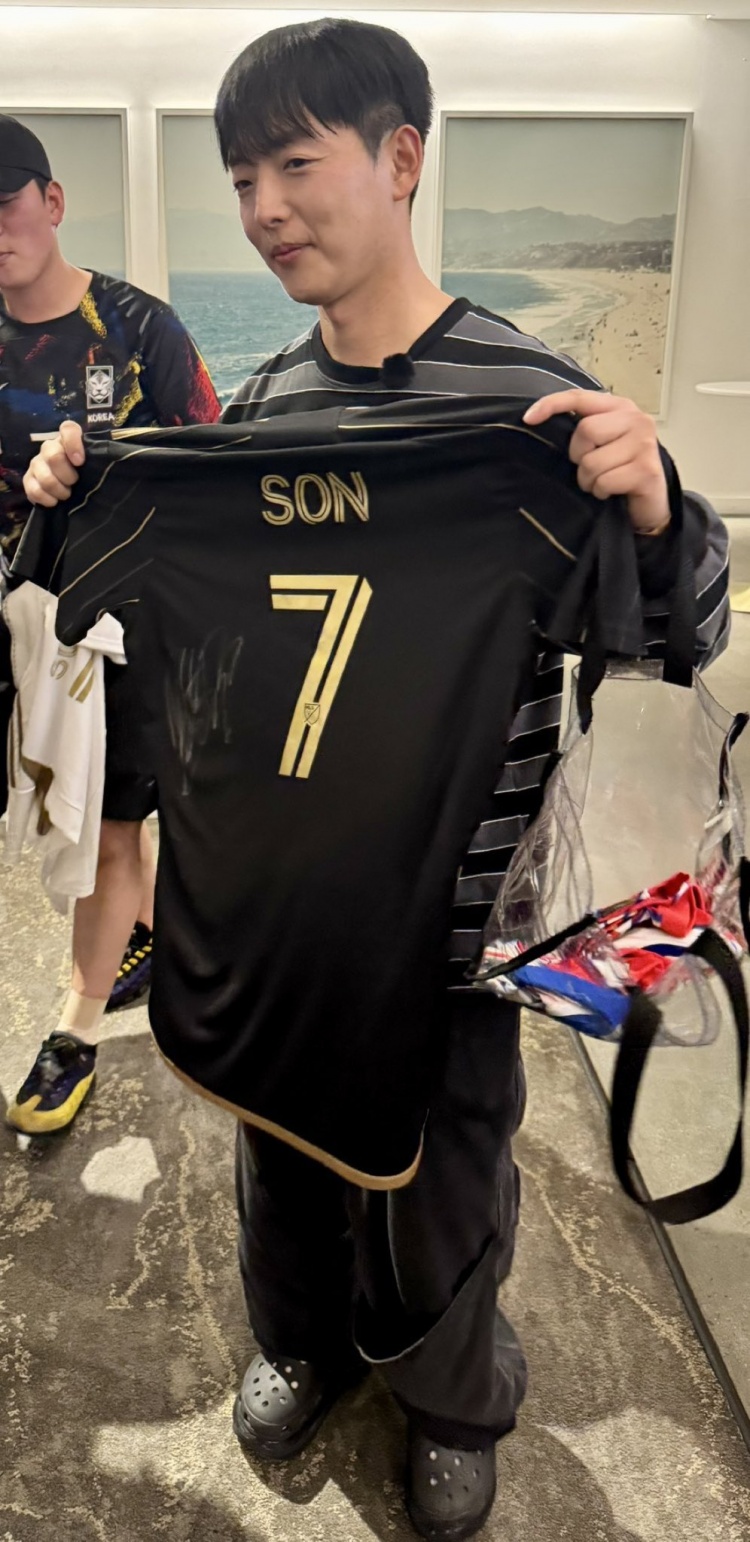 一位球迷手拿孫興慜印號的洛杉磯FC球衣接機(jī),并獲得了孫興慜的簽名,記者Favian Renkel社媒曬出照片,配文:“這絕對是第一件帶有簽名的洛杉磯FC孫興慜球衣,獨(dú)一無二的珍品!”
